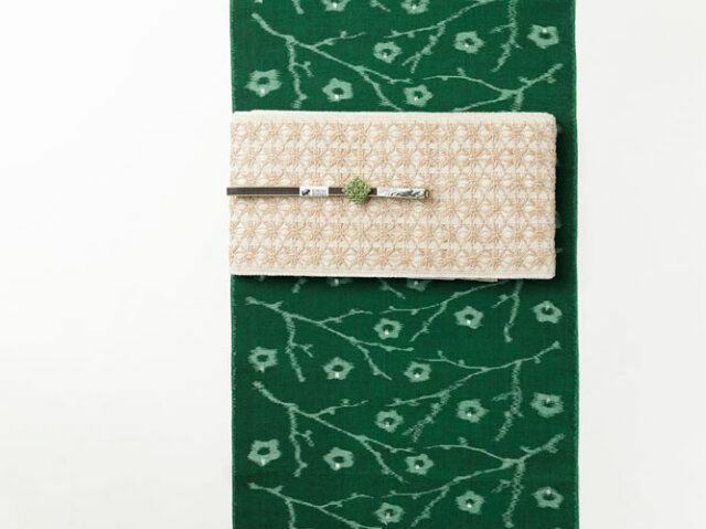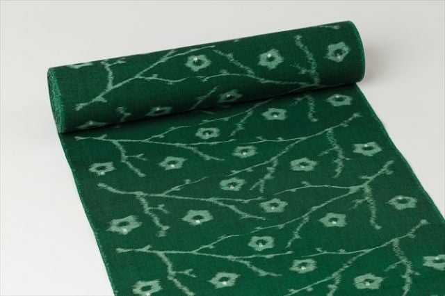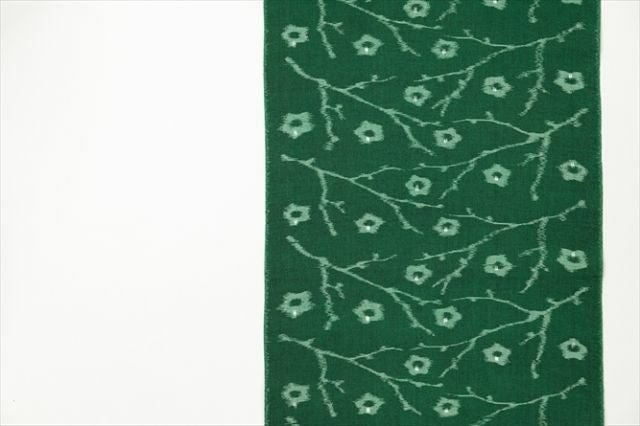 渋みと苦みをぎゅっと凝縮したような、濃いめのお抹茶を連想させる、珍しい色彩の久留米絣。まるで水墨画のように生き生きと、躍動感あふれる梅の木がモチーフ。