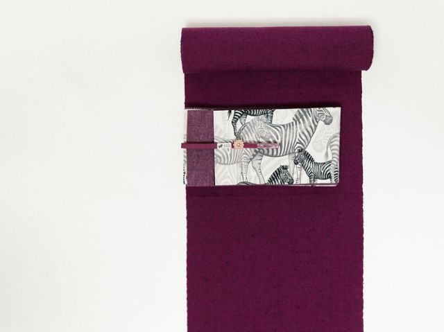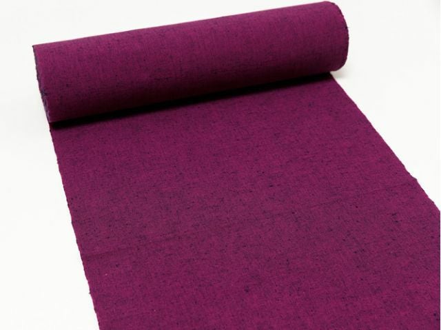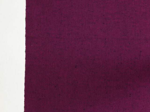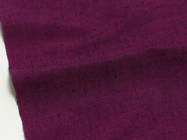 グラスに注いだ葡萄酒を、光にかざしながら味わうと。きっとこんな、ミステリアスな色合い。久留米絣といえば柄の入ったものを多く目にしますが、なかなか反物として市場に出て来ない珍しい無地絣。縦横異なる色彩の糸を織り込んだ、深みある発色。赤みの強い紫にも、青味を感じる赤紫にも、どちらとも言い表し難い、複雑な色合い。