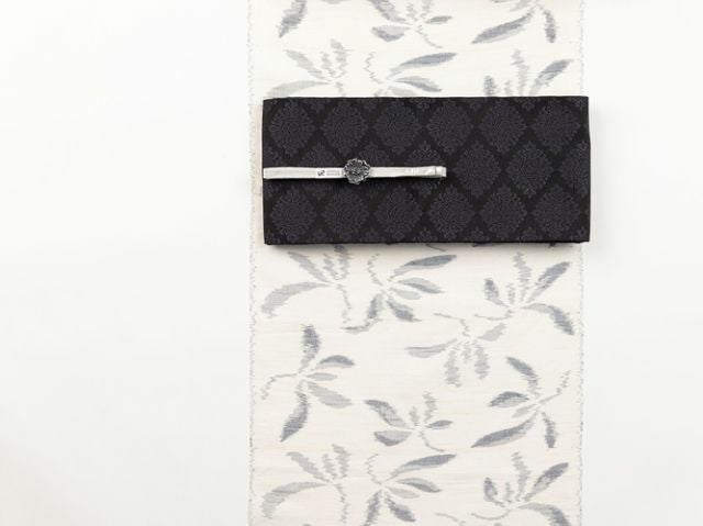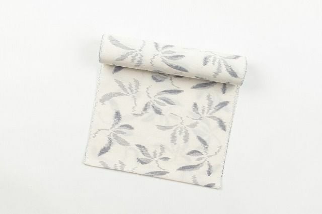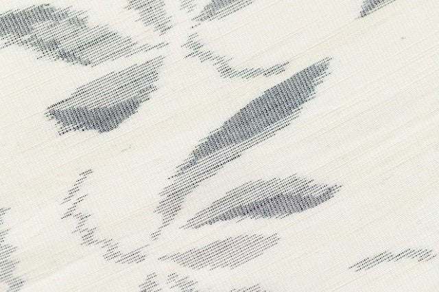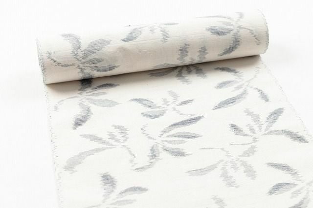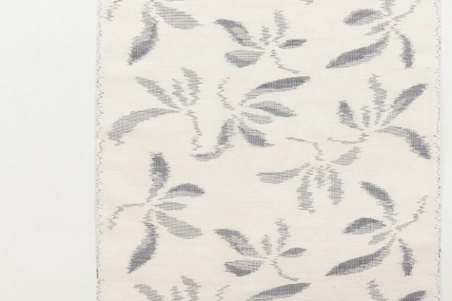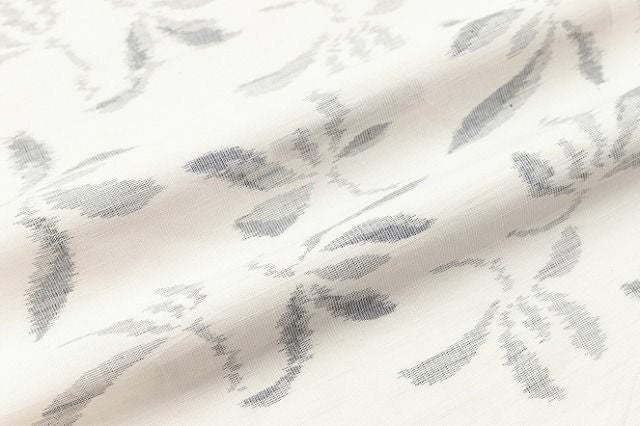 なぜだか優しい気持ちになれてしまう、素朴な白に薄墨のような濃淡で表現された花々が揺れ流れ落ちる様にノスタルジーを感じる。儚くも美しい、久留米絣をあなたに。