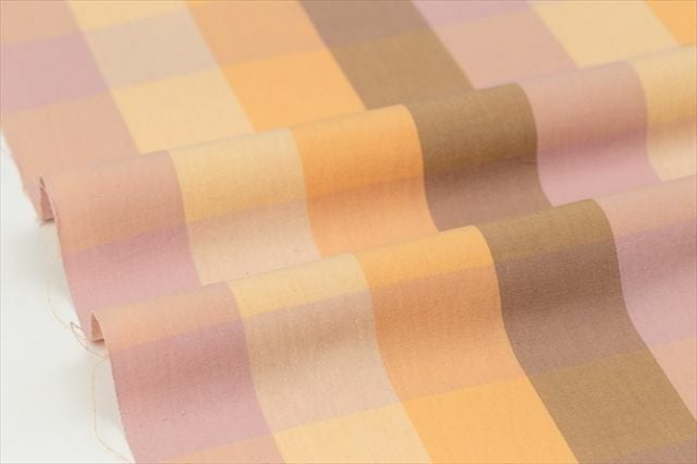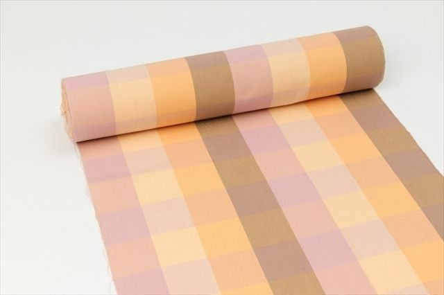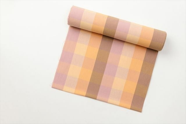 ブラウンやピンク、オレンジといったウォームカラーをグラデーションで配した格子柄。まとうだけでハッピーオーラをまとえそうな華やかな1着で、着物のデイリーコーデをぜひ楽しんで。