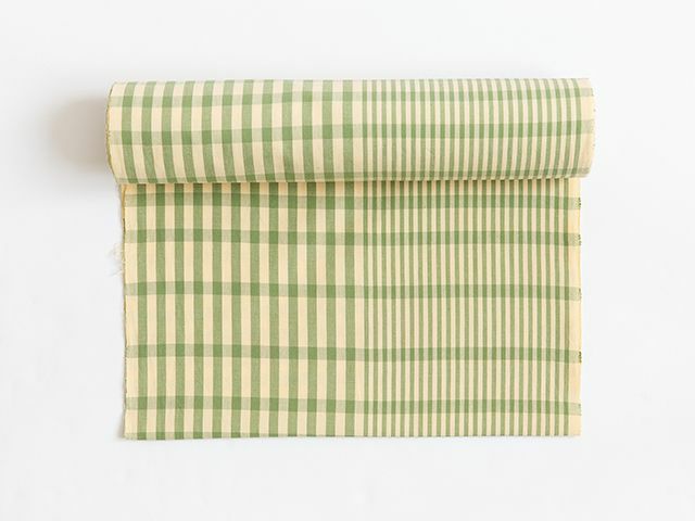 柔らかな雛鳥の羽毛のようなたまご色をベースに、抹茶色のマスキングテープが縦横ランダムに配置されたような模様。一見、ランダムのようであり、規則正しいようであり、その絶妙に変わる間隔が、新鮮な表情を見せてくれています。