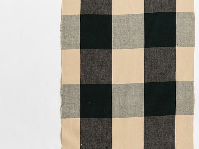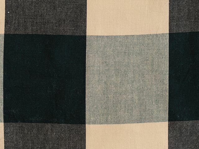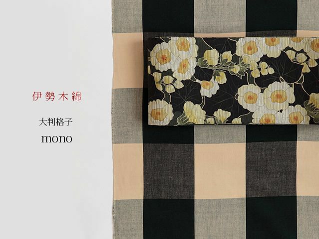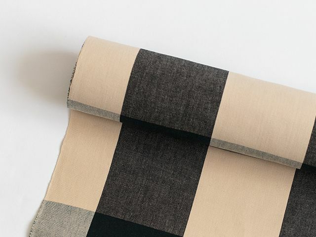 地色は優しい砂色ベージュ。やや深緑がかったようなブロックが横に、濃いめのグレイが縦に、組み合わせられて大胆な格子柄を描いています。