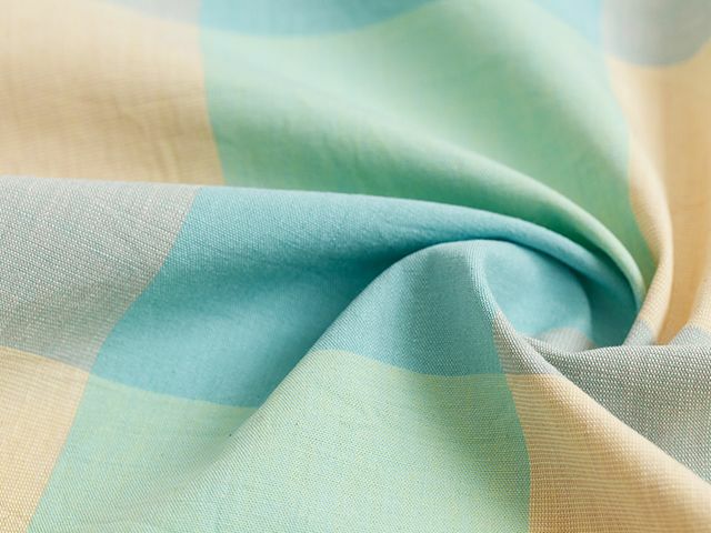 肌色っぽいベージュとグレイの基本格子に、ちょっと透明感の感じられる蛍光ペンみたいな水色に黄色が組み合わさった絶妙な色彩の着物生地です。生地の厚みは薄くもなく、厚すぎもせず、居敷当ても決して必要なわけではありませんが、動きの多い方はあった方が安心かもしれません。