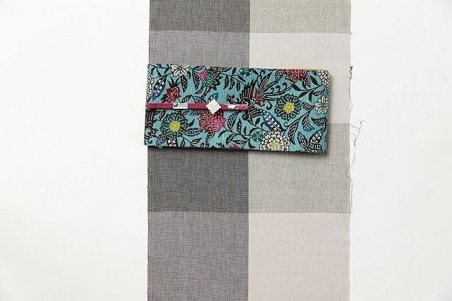 ベースはモノトーン。そしてやや緑がかかったようなグレイッシュトーンの色彩が、大胆にかけあわされた1着。大判格子の面白いところは、着物に仕立てたときの意外性とか遊び心にあるのですが、予想しなかったような楽しい展開にきっと心も弾むはず。