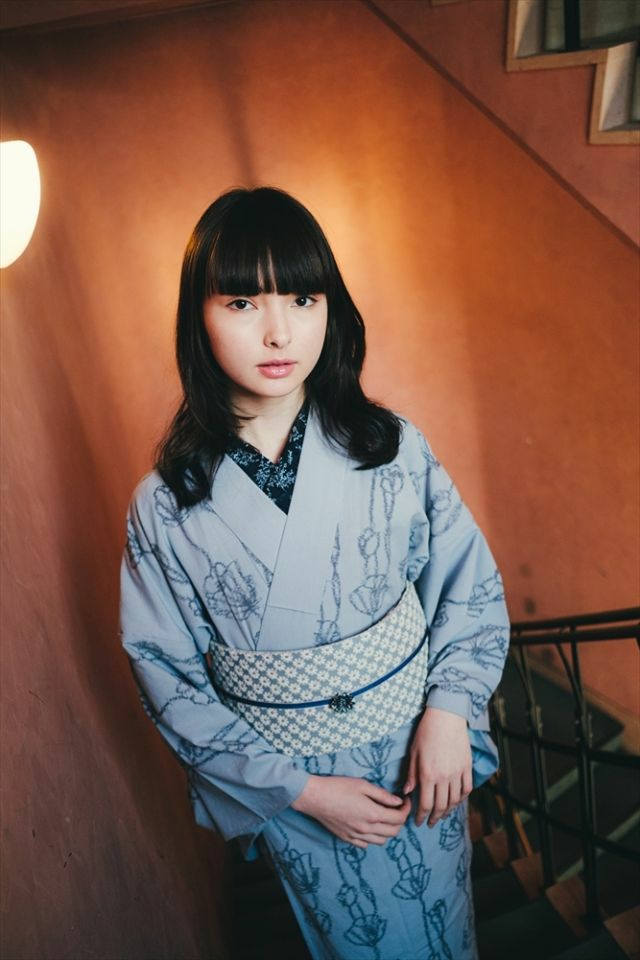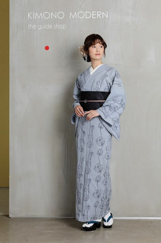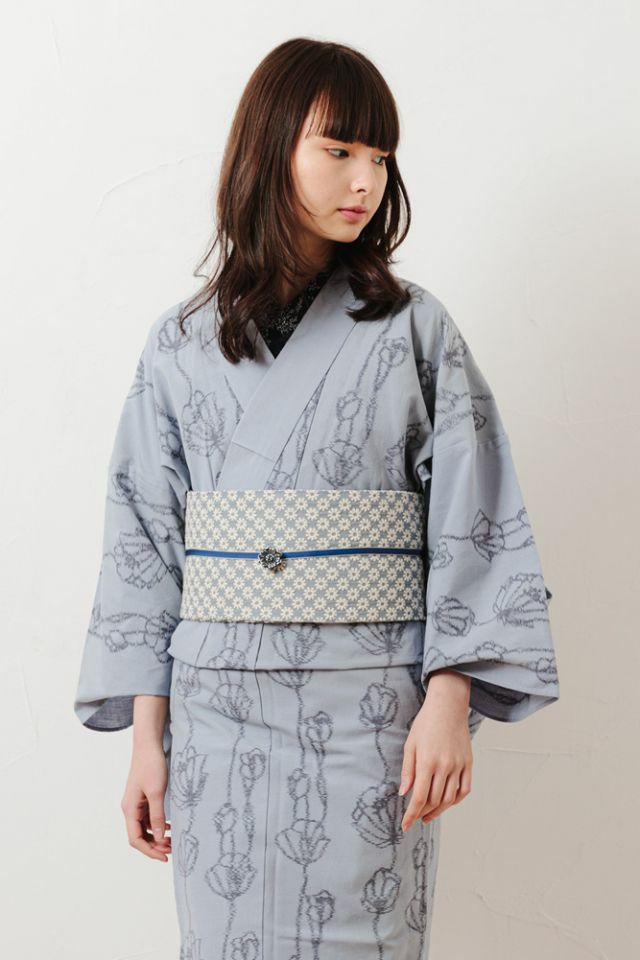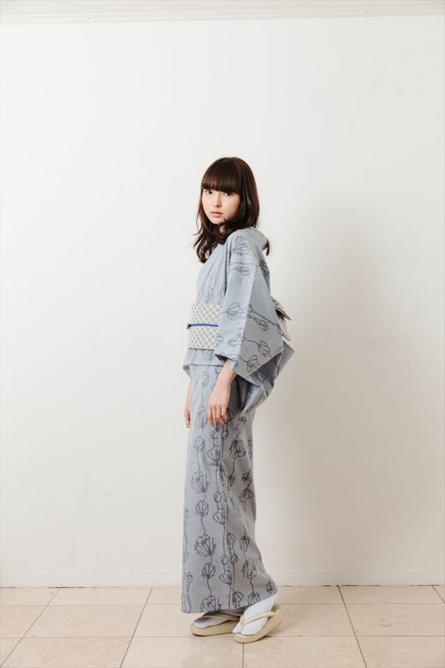 アンニュイ感漂うグレイッシュの地に、クラフト調のアーティーな花柄が織り出された久留米絣。縦に棚引くようにあしらわれた柄が、スラリとしたシルエットを引き立ててくれます。