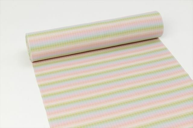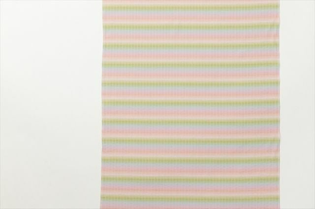 朝焼けの澄んだ空気感を彷彿とさせるような、ロマンティックな多色グラデーション。縦縞の着物は数あれど、横ボーダーでこんなにもカラフルな着物って見たことない!