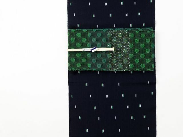 緑色の絣模様が、ベーシックな色柄の久留米絣を一捻り。クラシカルスタイルにポップで爽快なアクセントが加わり、より洒脱感のある着物スタイルが叶います。