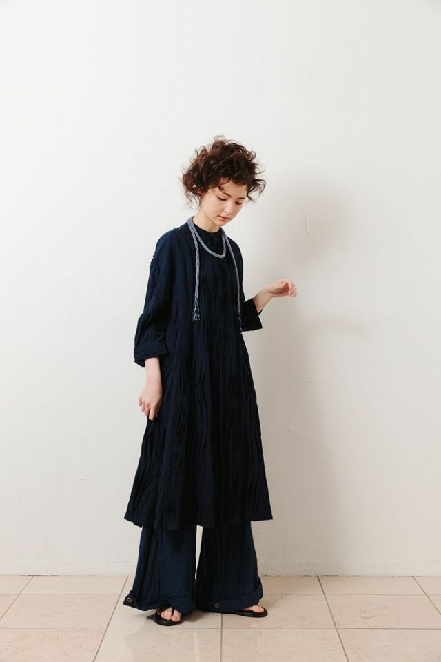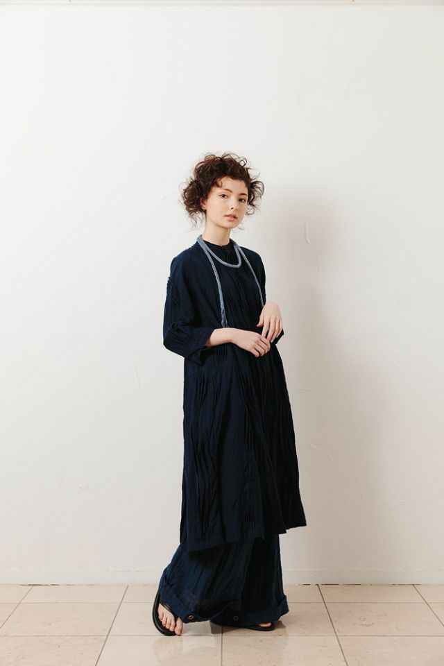 ピンタックのキリリとした雰囲気と合わせて、なぜだかほっこりとしたニュアンスを感じてしまう理由。それはなんと!仕立て上がり後にワンウオッシュ加工をかけ、綺麗に整頓されたプリーツをわざと遊ばせてあげるから。計算されているようで、計算されていない、絶妙にナチュラルなシワ感も、この加工がなせる技、なのです。