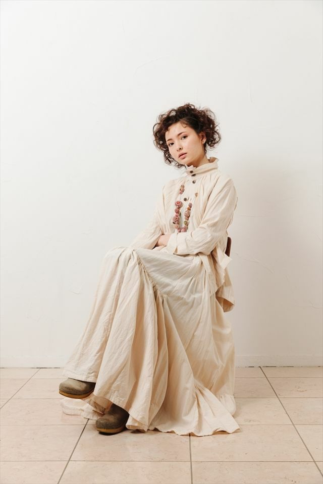 ピンタックとティアード使いが大人っぽさと柔らかさを表現。蹴回し6mという圧倒的な生地の分量により、ワンピースでありながらまるでドレスの佇まいに。自分自身が1輪の花であるかのような特別感を与えてくれます。