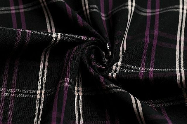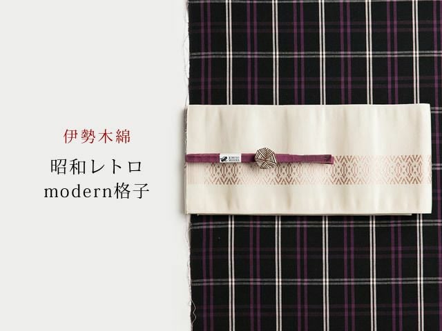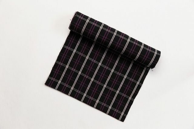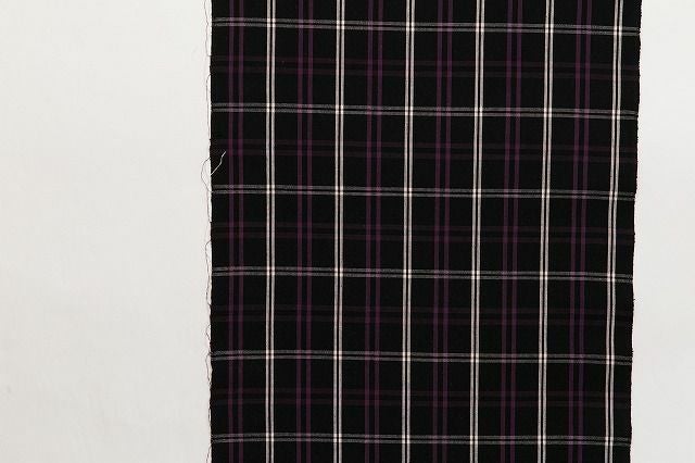 黒地x白のランダムな格子柄に、紫色のストライプがアクセントになった伊勢木綿。