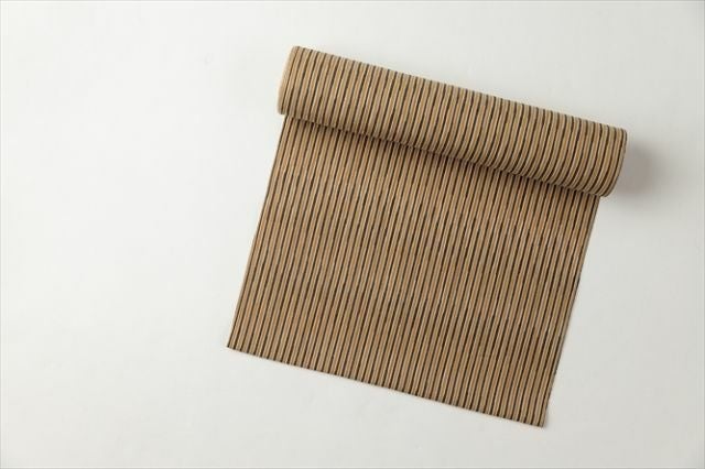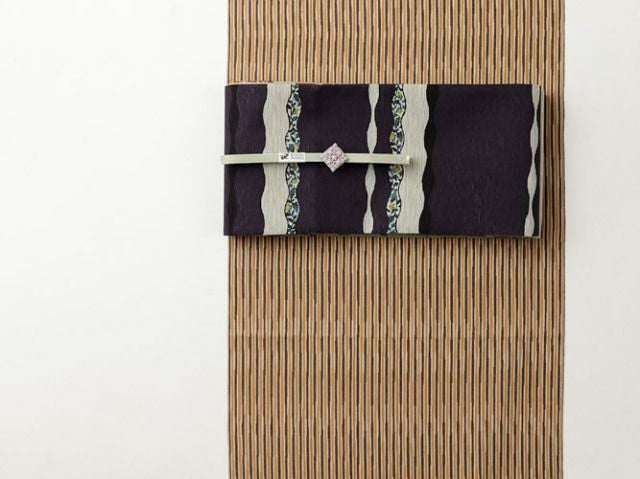 遠目に見ると、竹を編んだような立体的な模様に見える不思議な反物。立体的に見える秘密は、このストライプの細さとゆらゆらとゆらめくような形状にあるのかも。