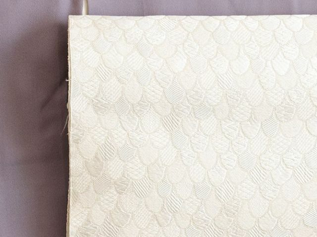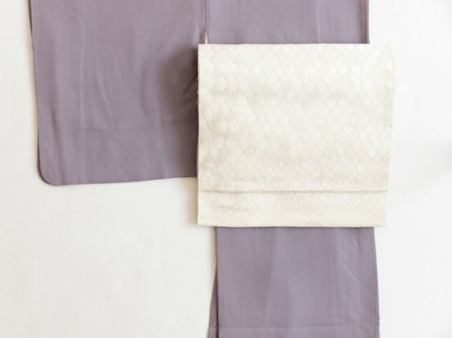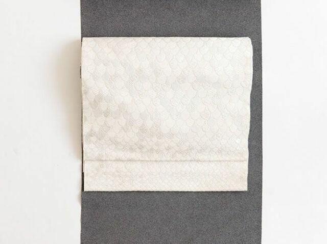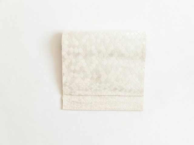 全体はまろみ感を持たせた白を貴重に、鱗文様が全体に、そしてお太鼓や帯前など目に触れる部分に銀糸が使われていて、シンプルな中にもさりげない高級感とこなれ感が漂います。