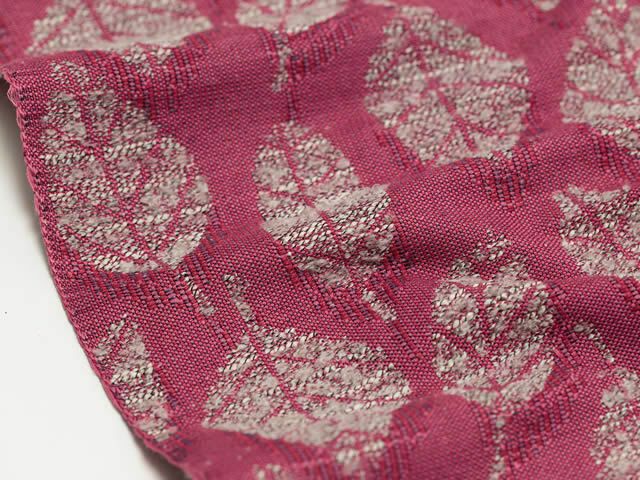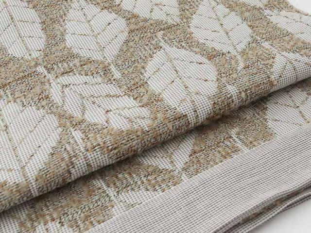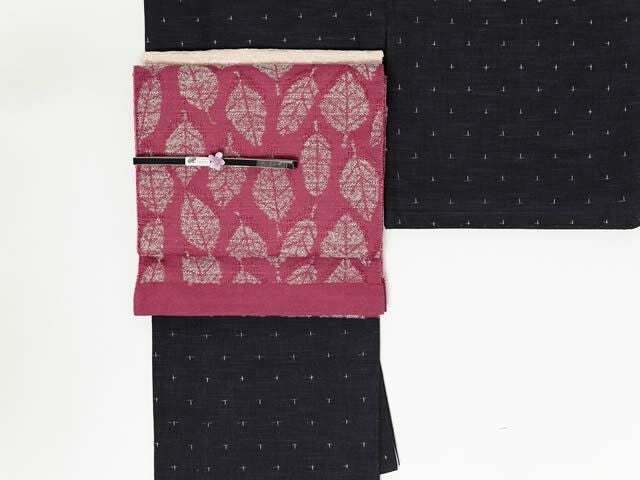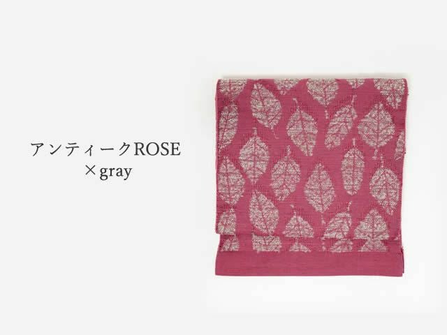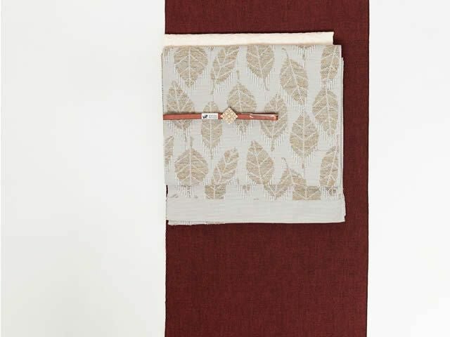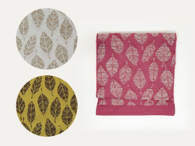 コットンをベースに、職人が惚れ込んだ意匠糸というモケモケ(?)した異素材を織り込み、これまでの帯にはなかったような、ほっこりとしたやさしい風合い。かといって、帯全体は軽く、しなやか。ちょうど葉っぱの部分、そして裏側の部分にそのホコホコな糸が立体的に織りなされ、優しさとかわいらしさやぬくもりを感じさせてくれます。