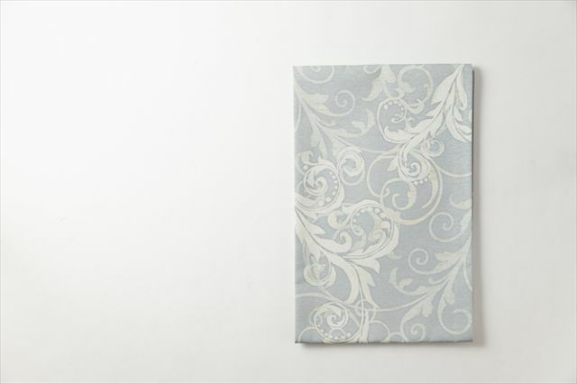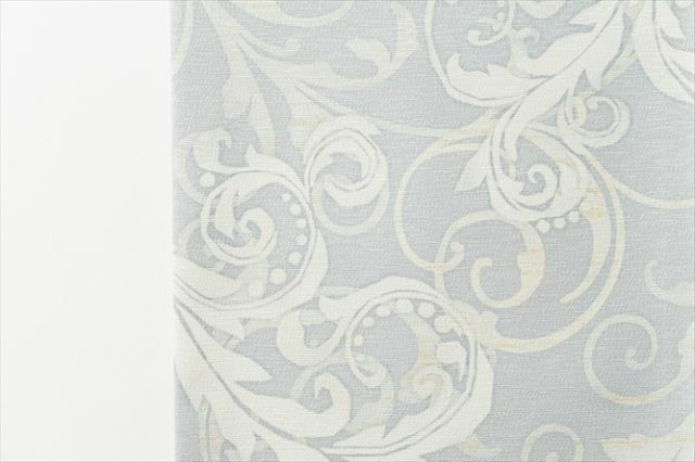くすみがかったブルーグレーの地にホワイトのアラベスク模様がデザインされた名古屋帯。大人女子が求める、カジュアルに転びすぎないエレガントな装いに。