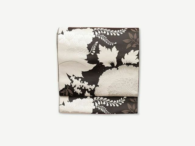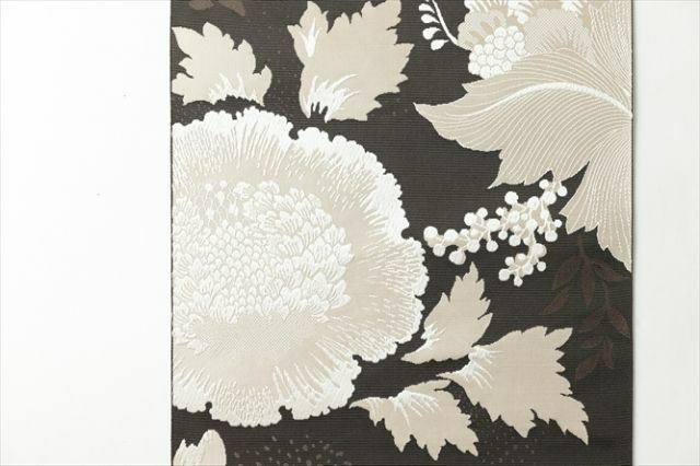 深い茶色と黒の混じり合ったような色を基調に、白地にベージュの大胆な植物紋様が浮かび上がる。それはまるで特別な世界に引き込まれたような気分さえするほど、高貴でいて。