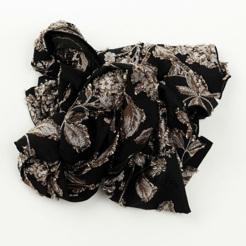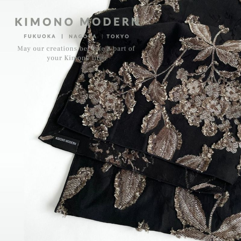 【Brown‐Black】漆黒の地色が、艶のあるブラウンやシルバーの織り柄を際立たせます。無地や細かい柄のきものに合わせてエレガントに。