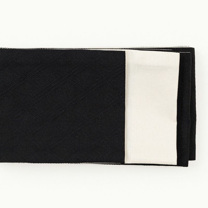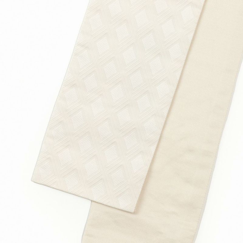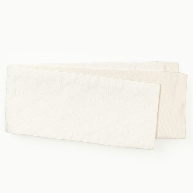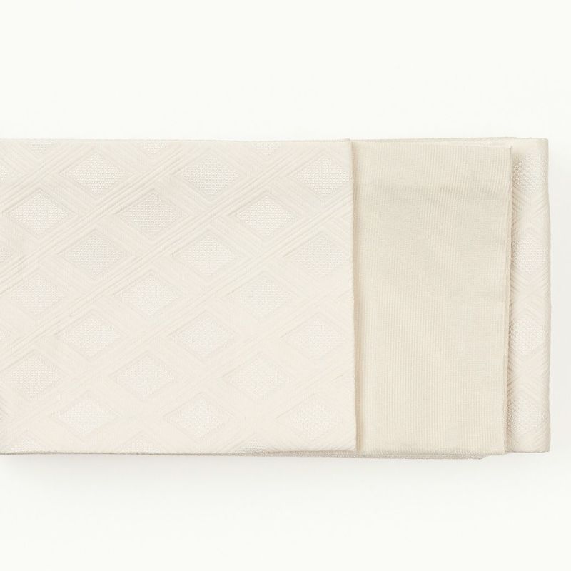 複雑な織でキラッと光るダイヤ型を囲うように、マットでふっくらした直線が縦横無尽に駆け巡ります。ハリはあるのに、しなやかな柔らかさも兼ね備えるので結びやすく、ふんわりボリュームを出す帯結びにも最適です。