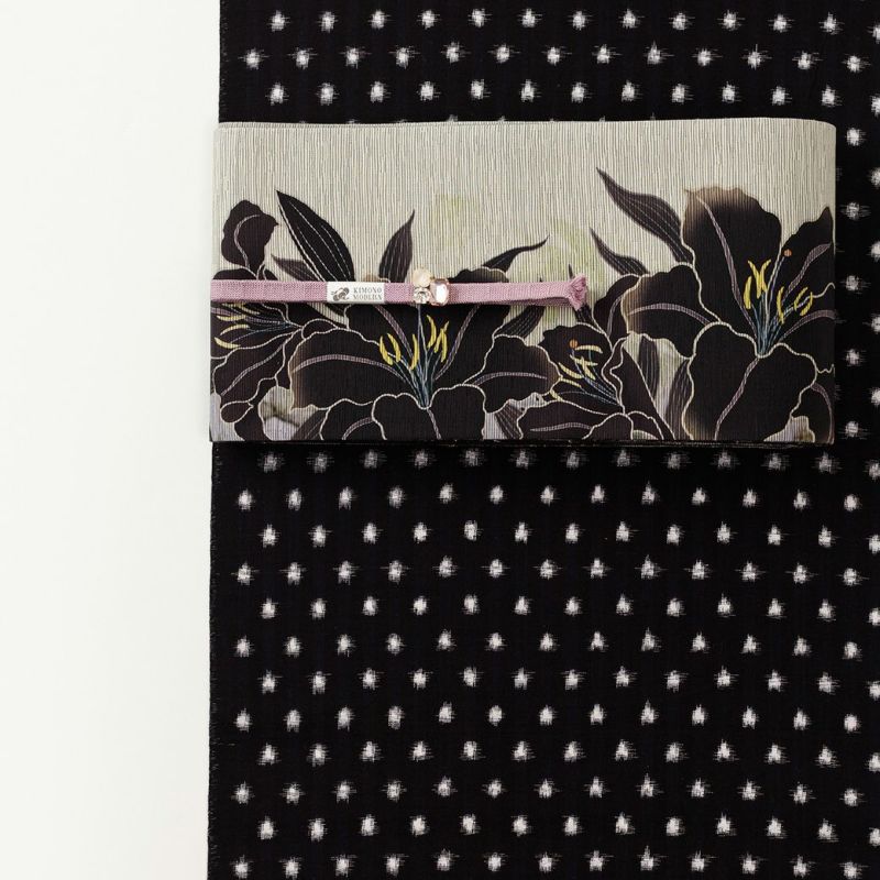凛と咲くカサブランカの花をまとう、この半幅帯。純白の大輪が放つ気品と、多彩な色彩が織りなす遊び心。