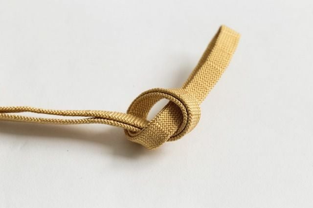 KIMONO MODERNの小さな帯留めが使用できるように、端っこはあえて房にせず、切りっぱなしに処理をしています。また、こちらは帯留め専用です。長さがたりないので、通常の平組や冠紐のような利用はできません。