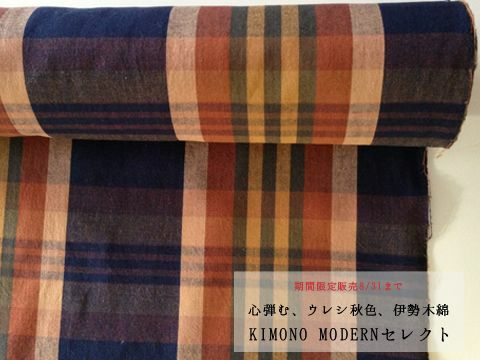 【期間限定販売8/31まで】心弾む、ウレシ秋色、伊勢木綿-KIMONO MODERNセレクトNO7(お仕立て代無料・水通し済)