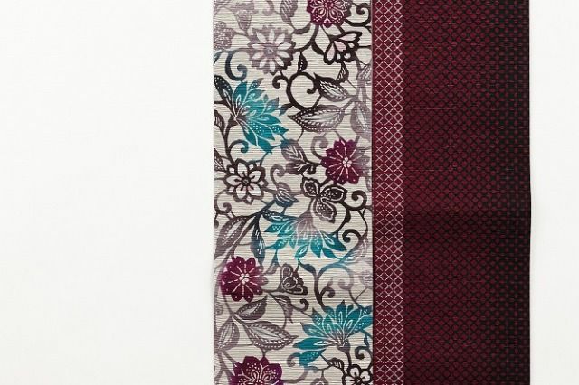 裏面は臙脂色をベースにしたシンプルなデザイン。表裏で全く異なるムードが感じられるので、コーディネートの幅がグッと広がりそう。生地は絹75%・ポリエステル25%。しなやかさと柔らかさのバランスが絶妙で、帯結びの形もキレイに決まります。