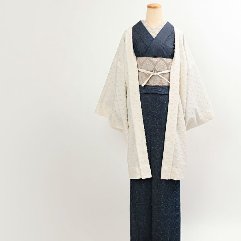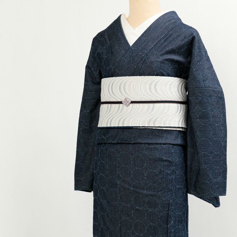 デニムの聖地岡山のデニムメーカーさんが開発した「シャボン玉カット」という技術を施したデニム素材を、いち早く取り入れ着物にしてみました。ぽこぽこっと小さなドットがまぁるい模様は点々と針穴を開けたような動きとテクスチャ。ちょっと変化球の好きなあなたにはぴったり。かといって、遠目からは無地。なんとも言えない不思議な素材感に、満足感いっぱい。
