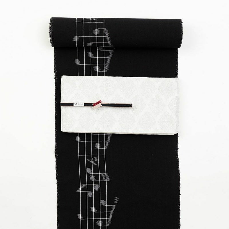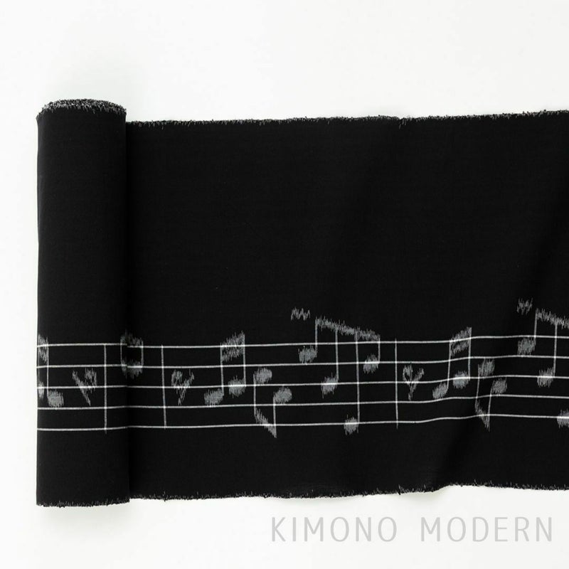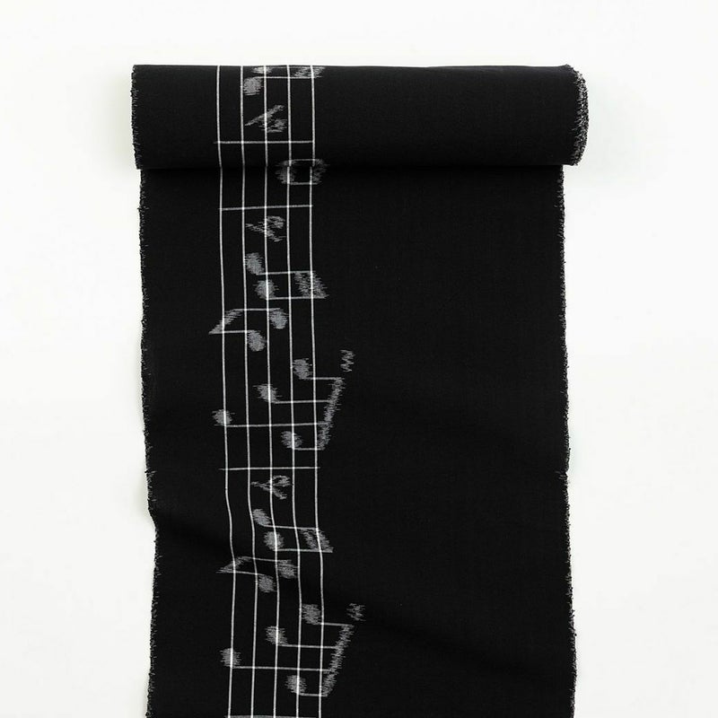 KIMONO MODERNオリジナルカラーで織っていただいた、定番ながらも目を引くBLACK。可愛くてPOPな柄だからこそ、あえてのモードな黒で。軽やかなホワイトで織られた楽譜が黒地によく映え、大人女子の持つクールさと可愛さを引き出します。