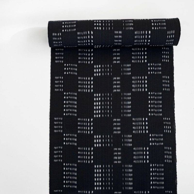 大きさも幅もあえて揃えず、不均一に配された柄が、布に奥行きとリズムを生み出します。