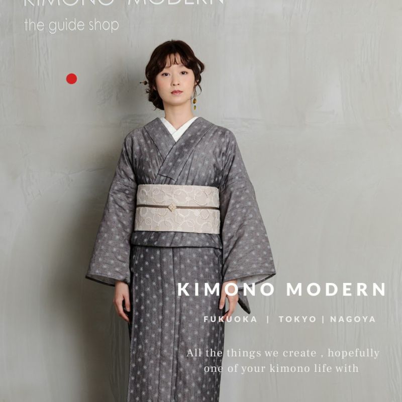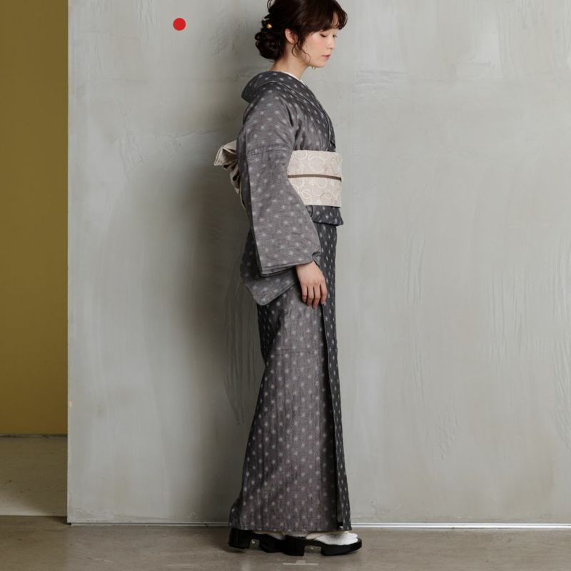 白銀世界に降り注ぐ雪をイメージさせる、幻想的な柄が施された小紋。グレーの濃淡で表現された柄は、アクセントになりつつも主張しすぎない絶妙な存在感。