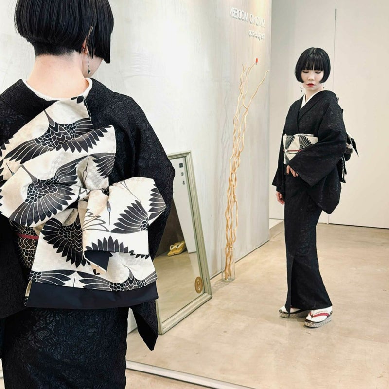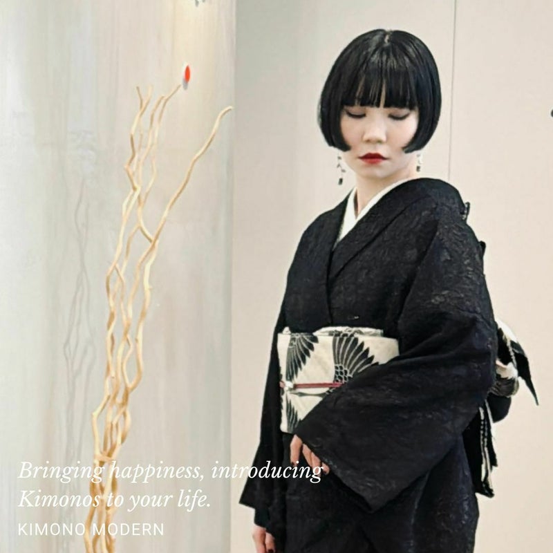 色無地感覚で着用OK。コードレースの上品な光沢が艶っぽく美しいDRESSYキモノ「AmberNight」に、小粋で印象的な鶴の帯を合わせました。色より素材や柄の印象で華やかさを演出し、一気にオシャレ上級者さんに変身するコーディネートです。