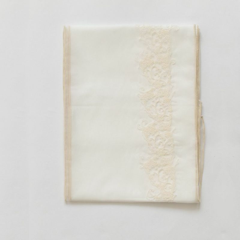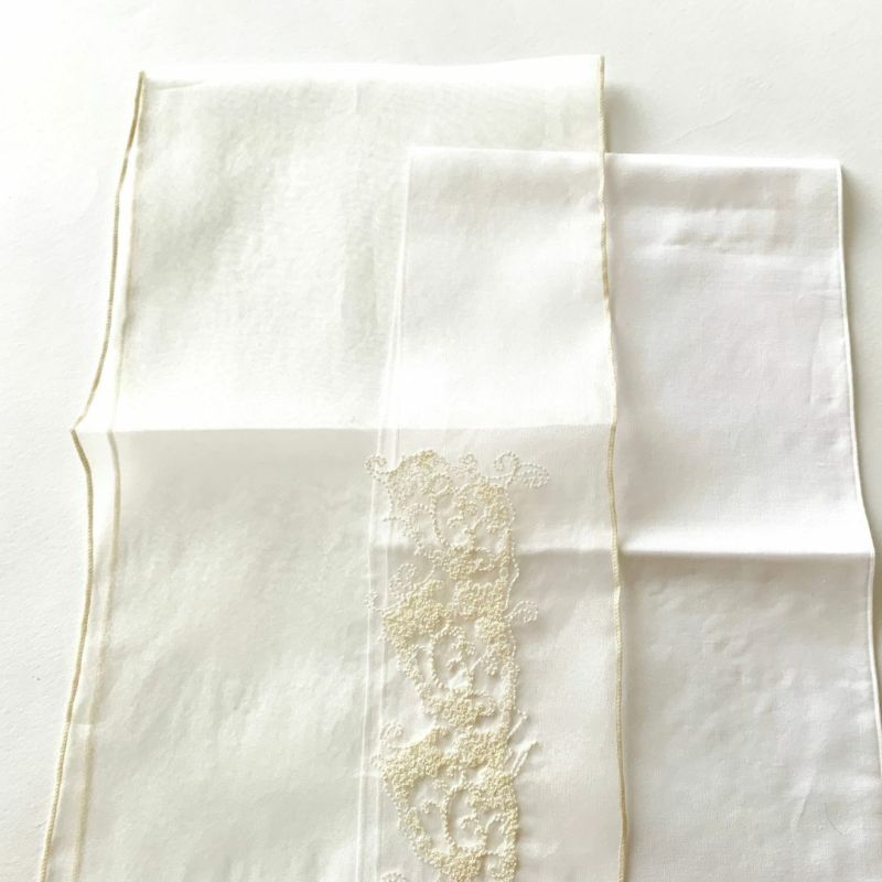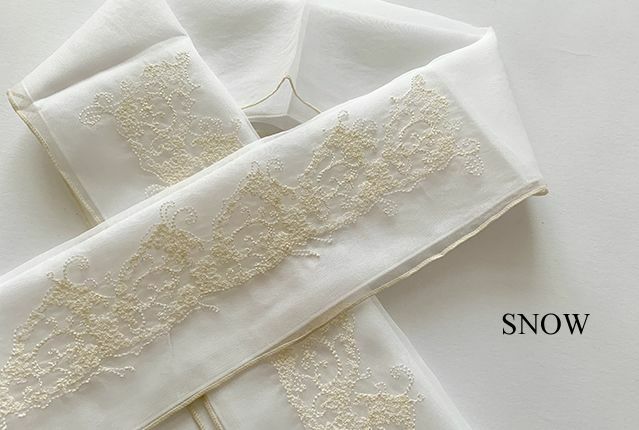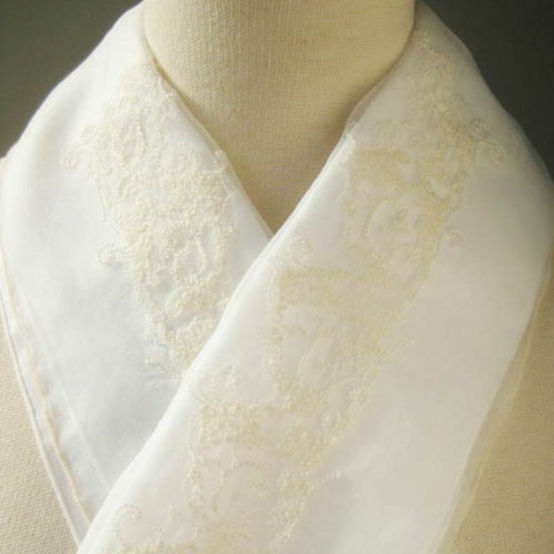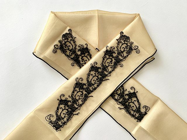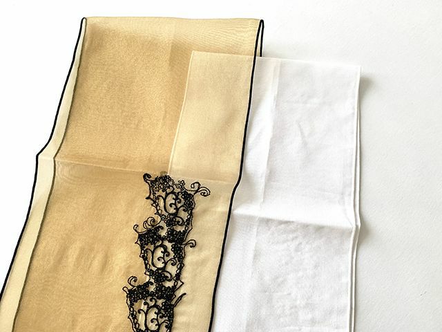 オーガンジーの生地感は柔らかさはもちろん、ふわふわしすぎず衿に縫い付けやすい程度のハリ感があります。透け感はありますが、カジュアルシーンであればオールシーズン活躍しそうなふわりとした透明感が美しい半衿です。