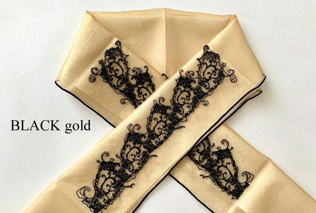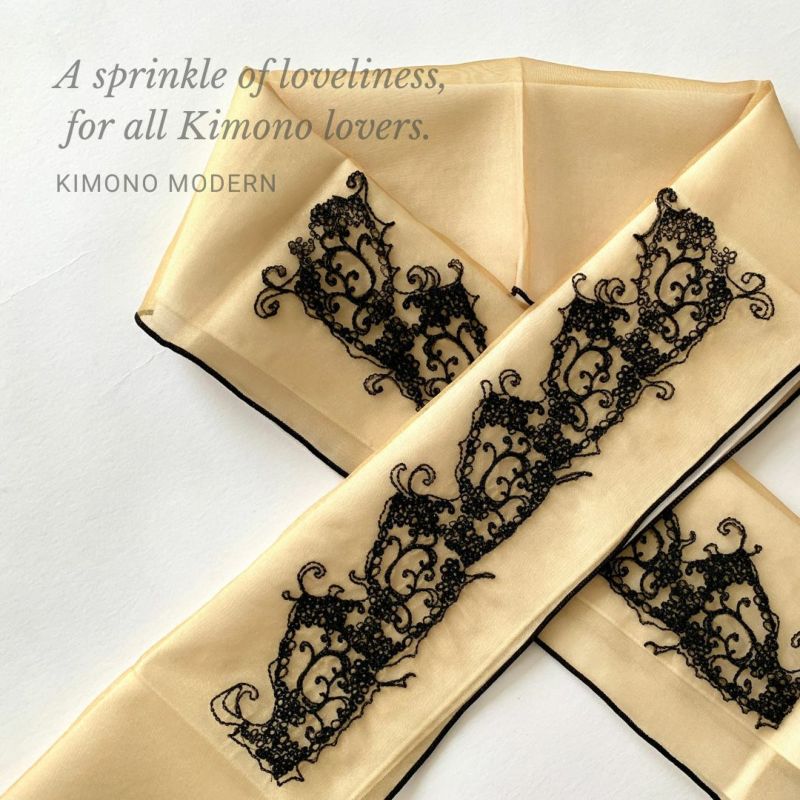 オーガンジー素材に、洗練された美しい刺繍を施した、ため息がでるほど美しい、半衿。イラストレーターペタ子さんのデザインは、時にかわいくて、時に美しい。