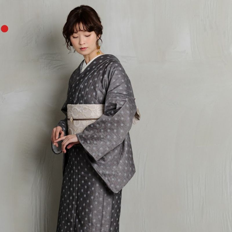 白銀世界に降り注ぐ雪をイメージさせる、幻想的な柄が施された小紋。グレーの濃淡で表現された柄は、アクセントになりつつも主張しすぎない絶妙な存在感。