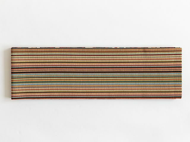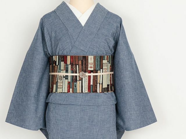 本棚をモチーフにした、なんとも楽しいデザイン。賑やかながら、アンティークでシックな色使いの半幅帯です。多色が入っているので、どんな着物の色とも合わせやすく、コーデ上手になること間違いなし。カラフルでシンプルなボーダー柄の裏面は、マルチに使える安心感が嬉しい。