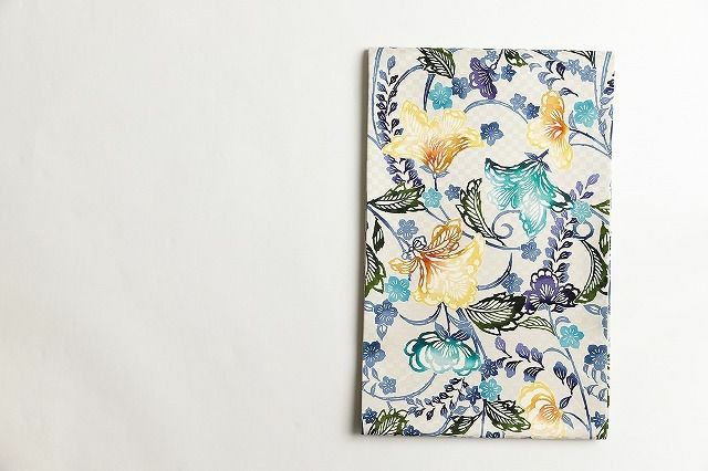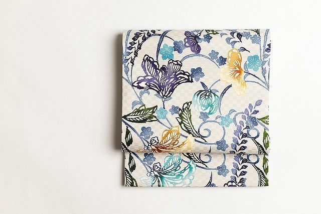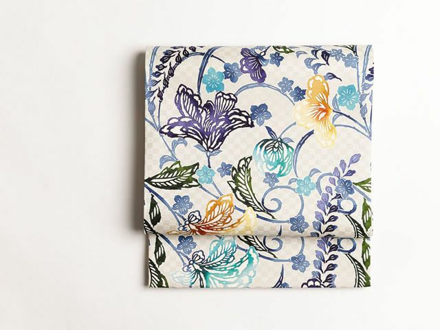 琉球紅型風の花唐草文様の京袋帯は、古典的な要素と南国風の要素が合わさって彩も鮮やか。つい地味になってしまうコーデも、これひとつで一気にテンションアップ。