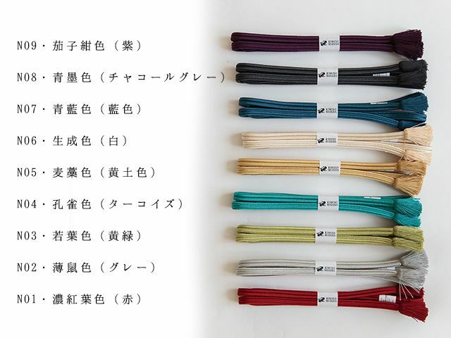 NO1・濃紅葉色(赤) / NO2・薄鼠色(グレー) / NO3・若葉色(黄緑) / NO4・孔雀色(ターコイズ) / NO5・麦藁色(黄土色) / NO6・生成色(白) / NO7・青藍色(藍色) / NO8・青墨色(チャコールグレー) / NO9・茄子紺色(紫 )