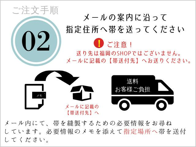A.ウエストサイズ・帯の希望のサイズ・柄だしの要望の3点をメモに書いて、帯と一緒に加工先へお送りください。