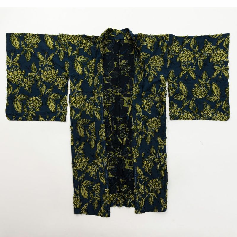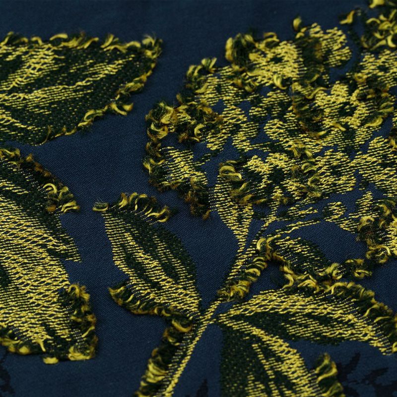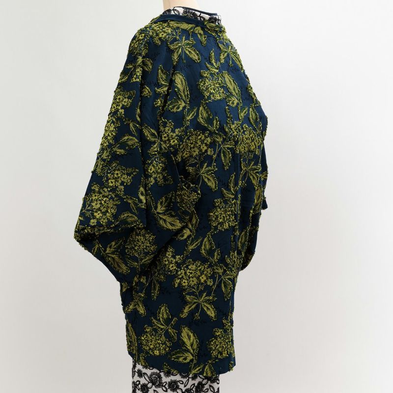 鮮やかなネイビーの地色に浮かぶイエローやグリーンの奥行き感のある織り柄に目を奪われます。デニムや木綿などカジュアルコーデの主役に。