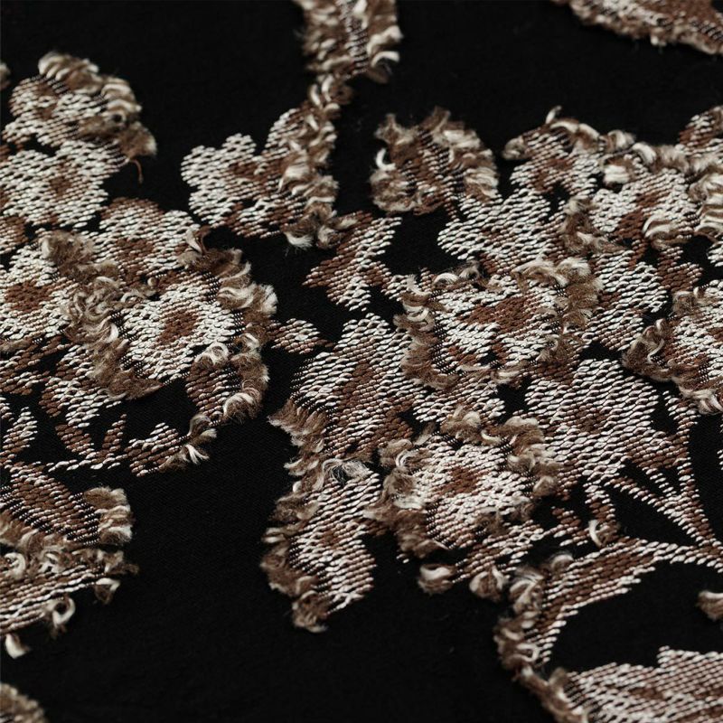 漆黒の地色が、艶のあるブラウンやシルバーの織り柄を際立たせます。無地や細かい柄のきものに合わせてエレガントに。