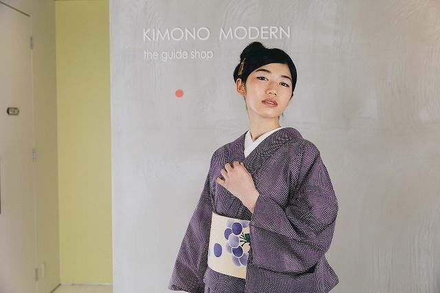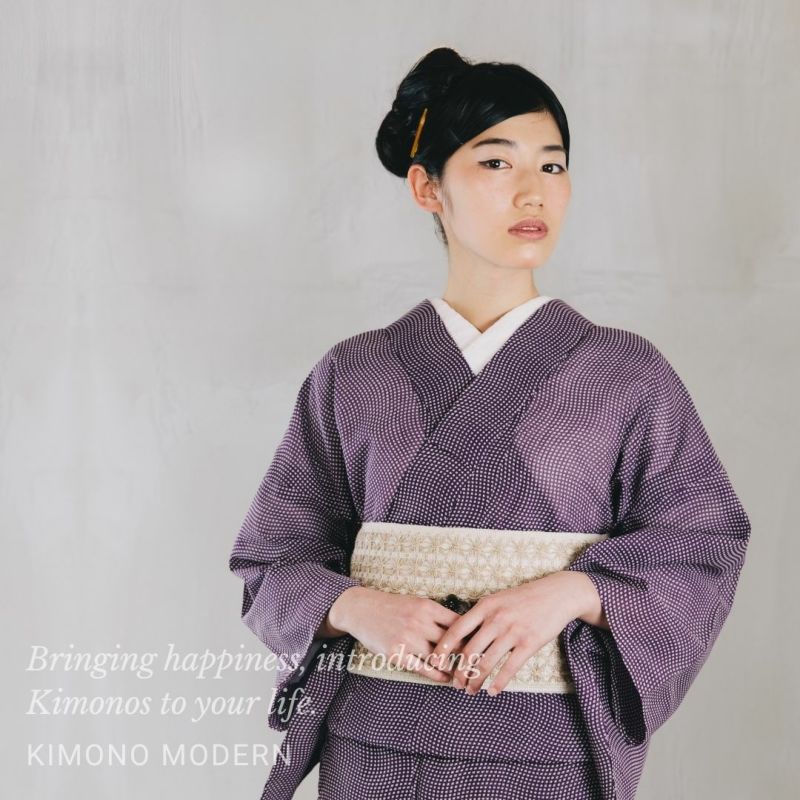 3. <夏キモノ浴衣>小紋風夏キモノな着こなしにー捺染ゆかた-シカクdrops-紫苑(綿100%・別送品)