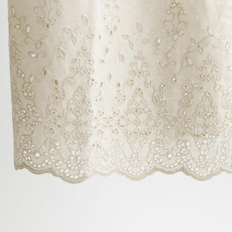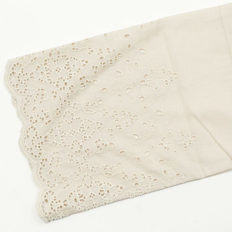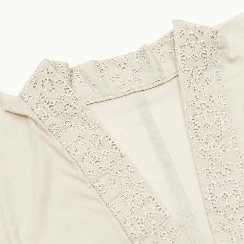 衿や筒袖部分にエスニック&エレガントな刺繍のスカラップ レースをあしらい、まとうだけで気分を上向きにしてくれます。
