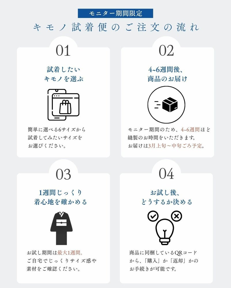 初回モニター分、試着品お届け 4ー6週間でお届け(3月上旬〜中旬ごろ目安) (※モニター期間のみ、新品でお届けするのでこの期間を頂戴しています。通常は5営業日以内に発送。)