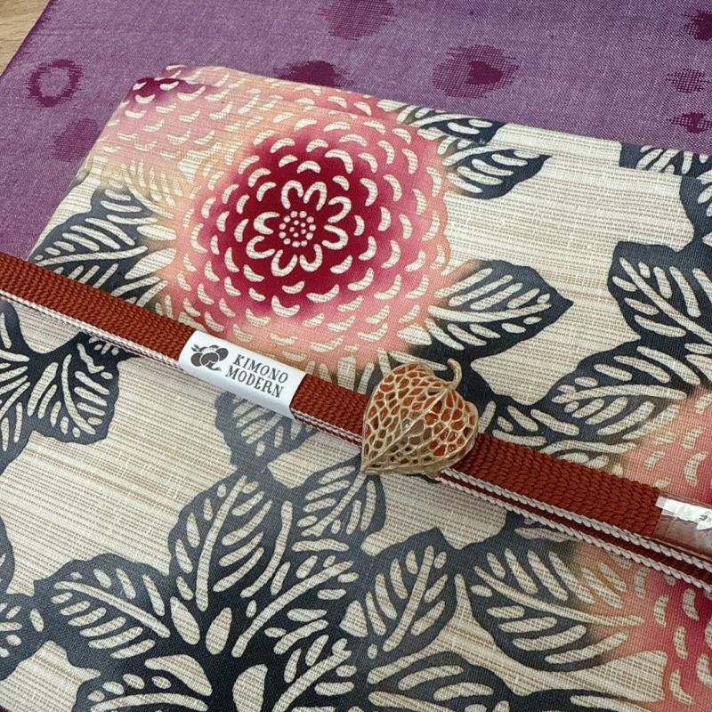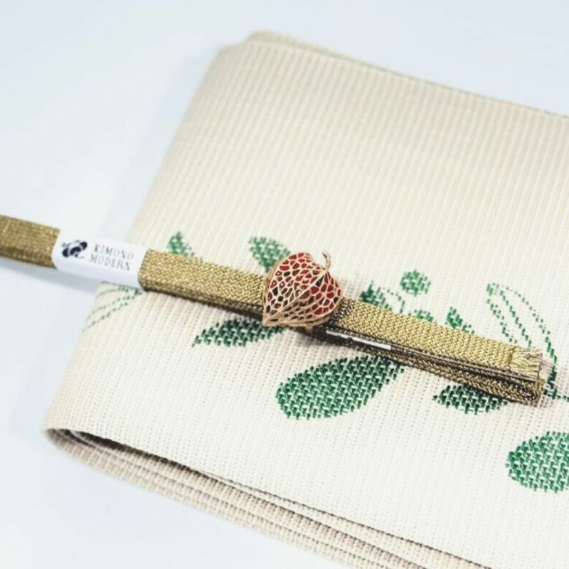 繊細な葉脈に艶やかなオレンジが光を透かす「鬼灯」の帯留め。中をのぞくと、パールでできた大きな実が秘めやかに佇んでいます。光を受けてやさしくきらめき、装いに秋の気配と上品な華やぎを添えます。職人の手彩色で一点ごとに表情が異なる特別感を。